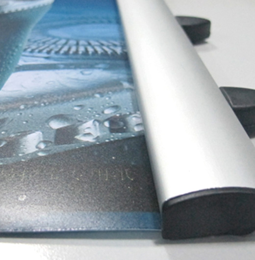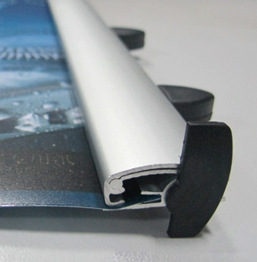 The banner line is in a clip style structure to hold kinds of graphic such as fabric , vinyl material etc . The material is all in Aluminum with 32mm wide profile which is quite stable and durable. The snap open and close technology makes these poster hangers very quick and easy to operate. The rails are made from silver anodized aluminum with plastic end caps and two hangers. The length of banner line can be customized.