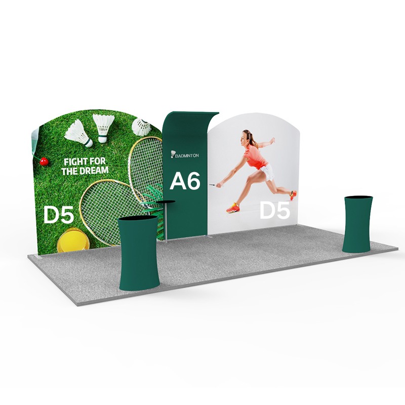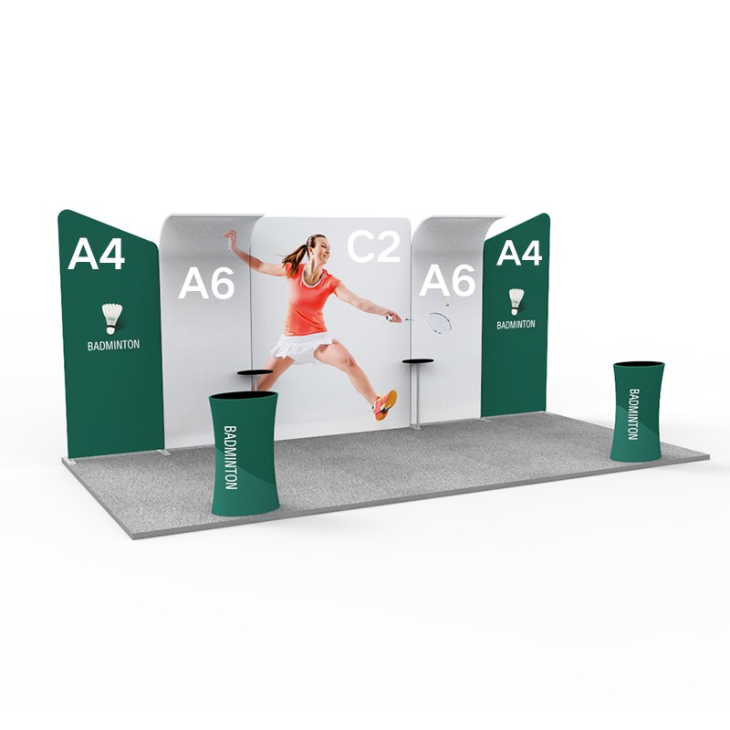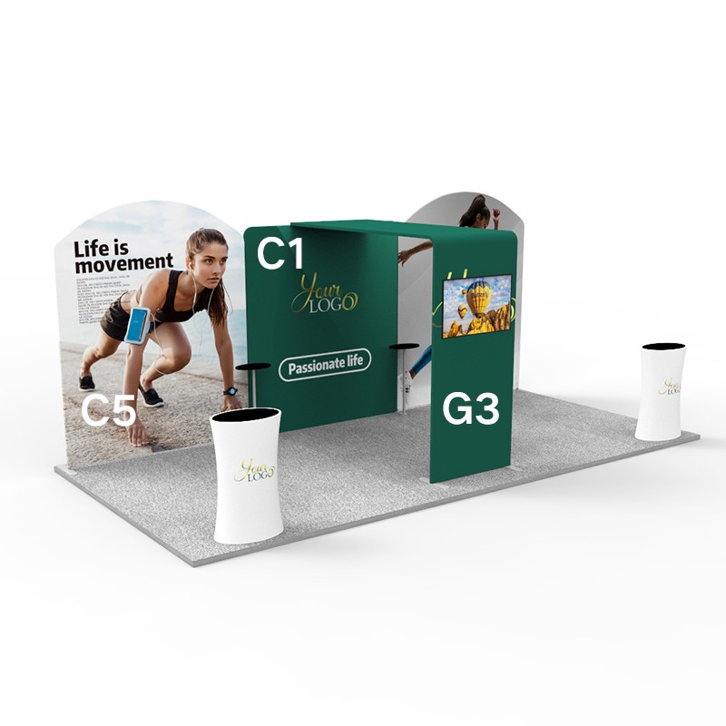 3*6m booth is the most popular use for exhibition, by use the EZ modular system, it can be set up quickly to save labor and convenent transportation. The package is small and can even put inside a car to take. With differnt series stand from A/B/C/D/G, it can set up various shape 3*6m booth. It can be widely used in any events, advertising, exhibitions, stores etc.