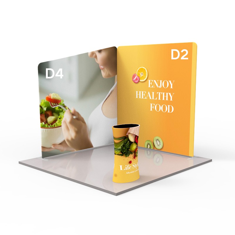 3*3m booth is the most popular use for exhibition, by use the EZ modular system, it can be set up quickly to save labor and convenent transportation. The package is small and can even put inside a car to take. With differnt series stand from A/B/C/D/G, it can set up various shape 3*3m booth. It can be widely used in any events, advertising, exhibitions, stores etc.