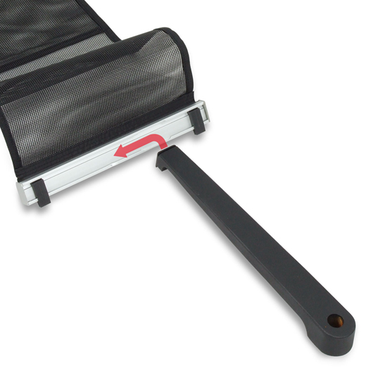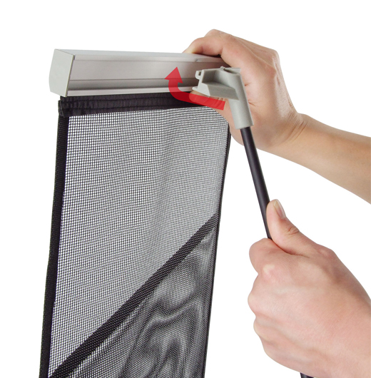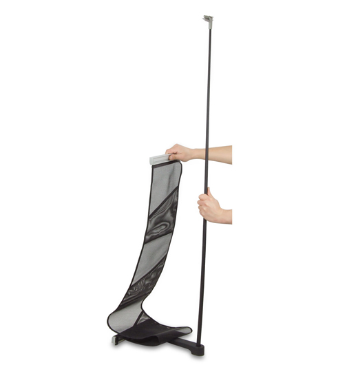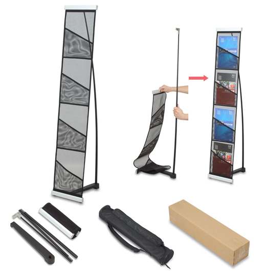 This is a catalogue holder with 4 brochure pockets.It is made of netting (mesh material),iron foot and fibre pole. Black pocket with black foot,grey pocket with grey foot is better for your choice.