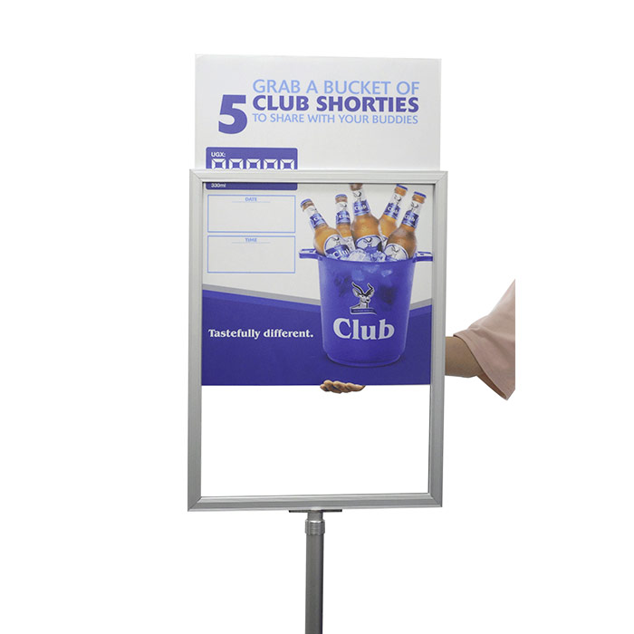 The aluminum poster holder is with the elegant design, the “Inserted Poster” frame can show the advertising information by double sides.The telescopic post make the frame much more height freedom , and the different sizes could be used in the bank, shopping mall and other places.