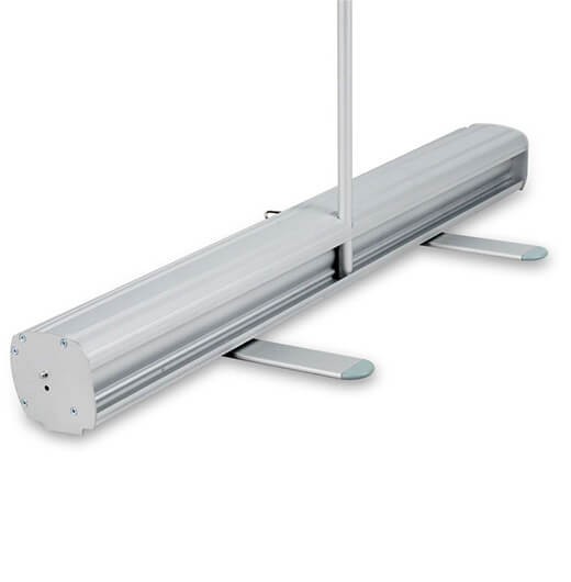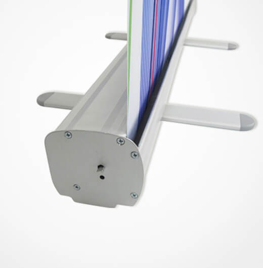 The roll up stand is pulled out and retracted from the aluminum bracket or base for maximum portability. This feature makes these banners a signage solution for trade shows, events and conferences. Your retractable banner and metal base will continue to be used in many future events.