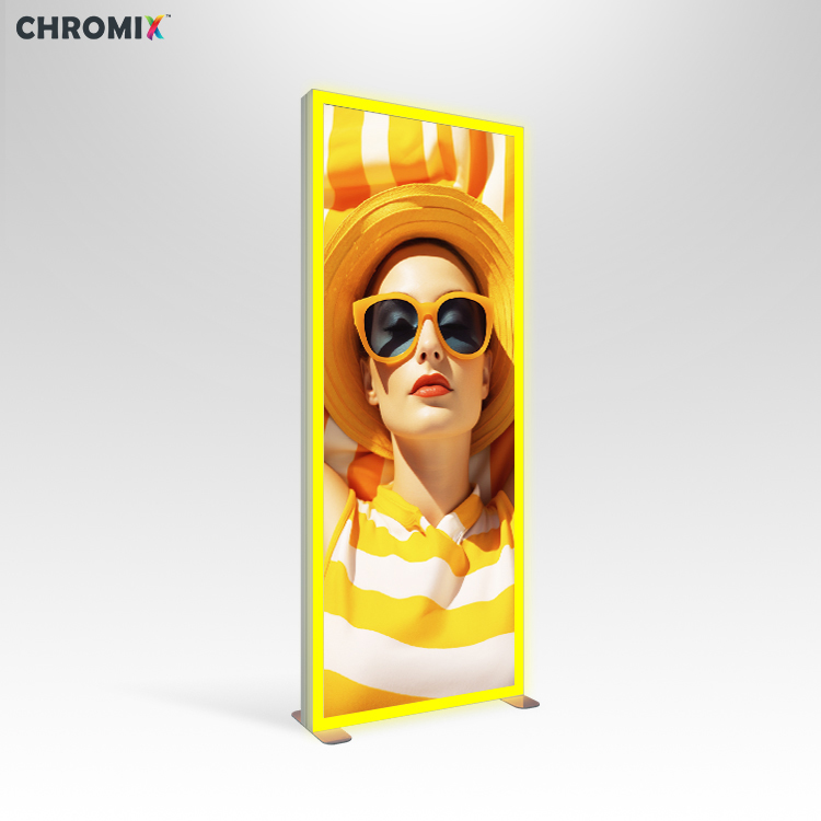 أ: chromix عبارة عن إطار ألومنيوم معياري مزود بإضاءة حافة LED RGB مدمجة، مصمم للعروض الديناميكية في المعارض ومتاجر البيع بالتجزئة.