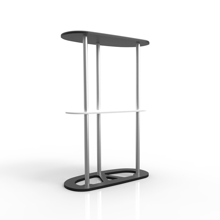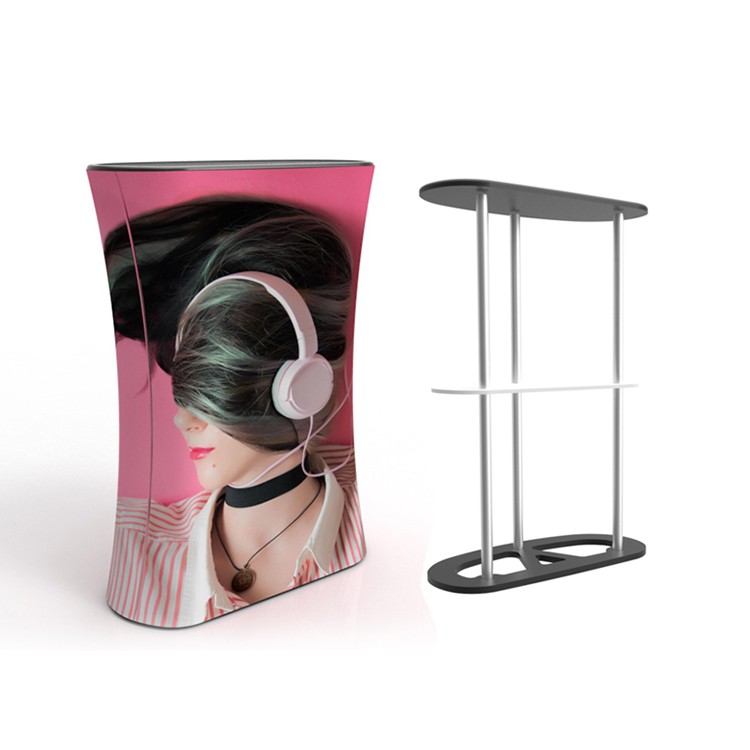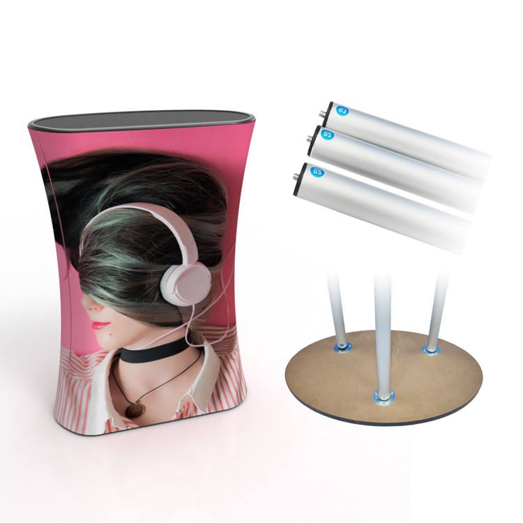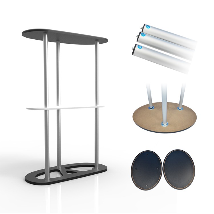 أنبوب دائري مزود بآلية زر كبس يجعل تركيبه في غاية السهولة. طاولة الاستقبال القماشية سهلة الحمل والتنقل، ويمكن استخدامها في مناسبات مختلفة مثل العروض الترويجية، ومكاتب استقبال المعارض التجارية، وغيرها.